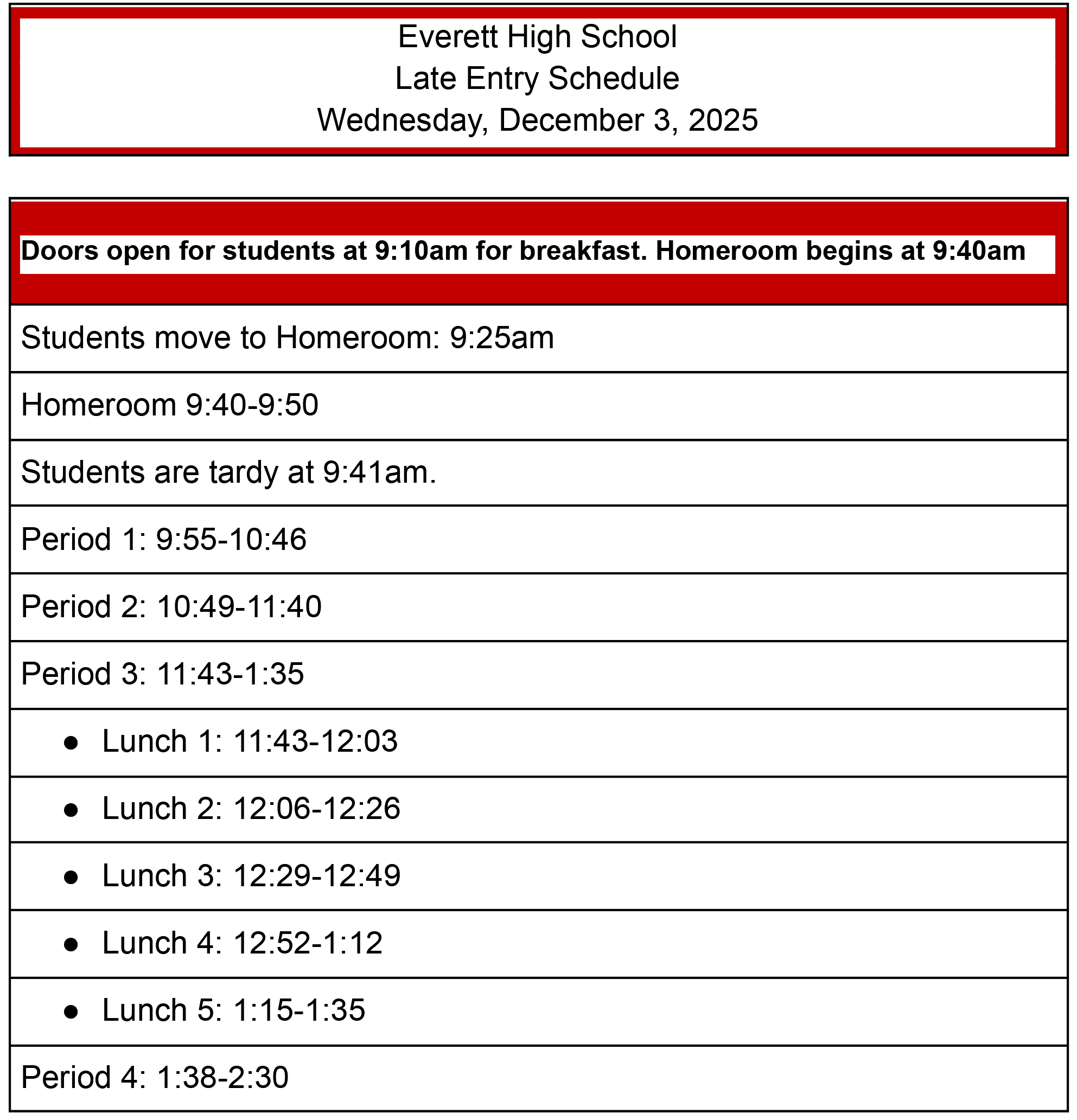 Our daily student attendance at Everett High School continues to improve. As a reminder, a student is considered chronically absent if the student has 16 or more absences in a school year. We appreciate your support in continuously improving student attendance at EHS.