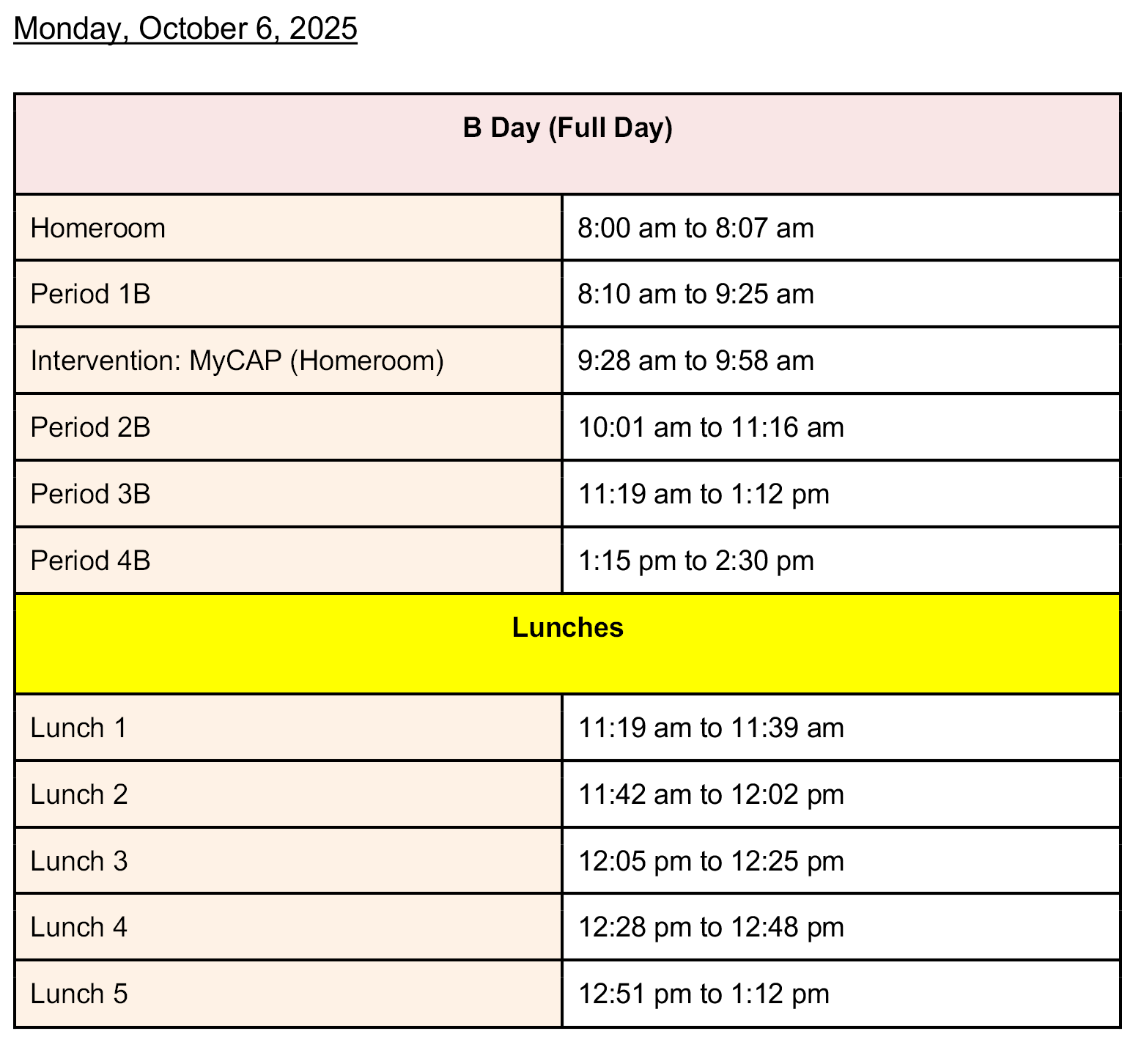Monday, October 6, 2025 (B Day)